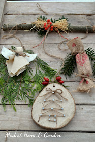 És a központi díszhez szeletelt fa korongba kalapáltunk szögeket, majd a szögek köré madzagból tekergettünk, alakítottunk karácsonyfa formát.